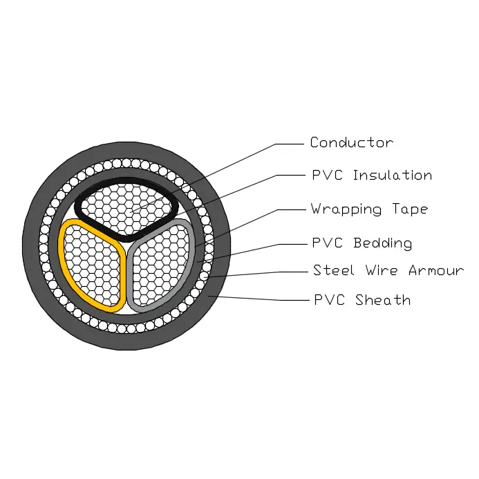Bilang isang propesyonal na tagagawa, ang BS 6346 power cable ng Beida ay gumagamit ng mga advanced na PVC insulation at sheath na materyales, na may disenyo ng steel wire armor, na maaaring epektibong labanan ang panlabas na tensyon at presyon upang matiyak ang pangmatagalang matatag na operasyon ng cable. Nag-aalok ang mga BS 6346 power cable ng mataas na antas ng kaligtasan at katatagan, naka-install man sa loob ng mga gusali o nakabaon nang direkta sa ilalim ng lupa. Ang copper conductor, PVC cushion at steel wire armor na disenyo nito ay nagbibigay-daan sa cable na makatiis ng pisikal na presyon sa mga kumplikadong kapaligiran, matiyak ang normal na operasyon ng mga power system, at malutas ang problema na ang mga tradisyunal na power cable ay madaling masira sa malupit na kapaligiran.