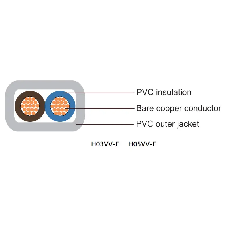 Ang H05VV-F, H05VVH2-F, H03VV-F, H03VVH2-F ay binubuo ng Class 5 fine copper conductor, lead-free PVC insulation at sheath.